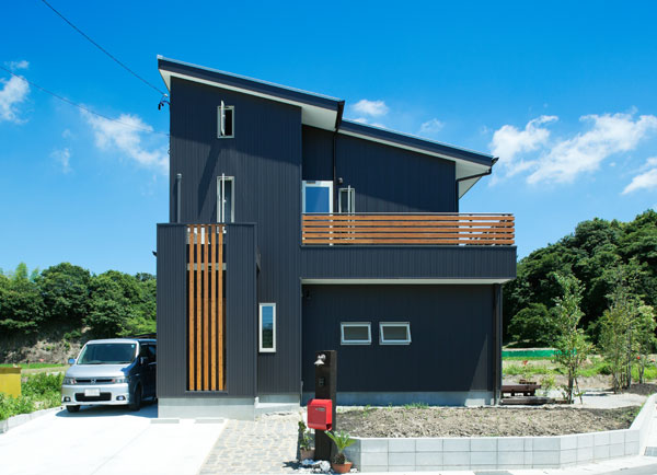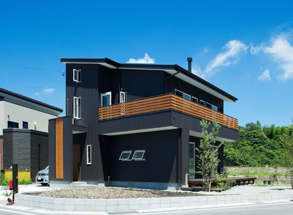 黒い壁面に木目が映える外観