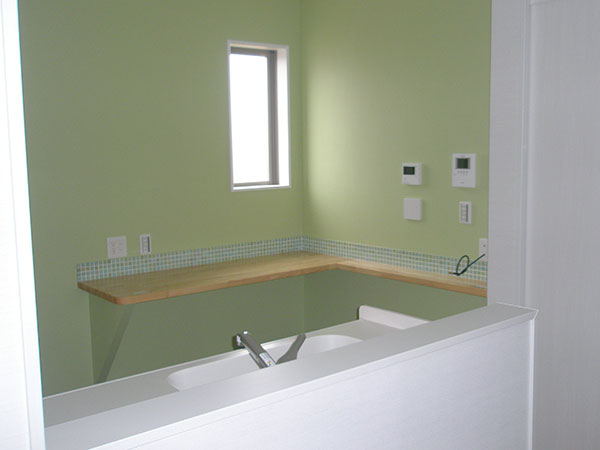 外観にあわせたポップなグリーンの壁がポイントのキッチン