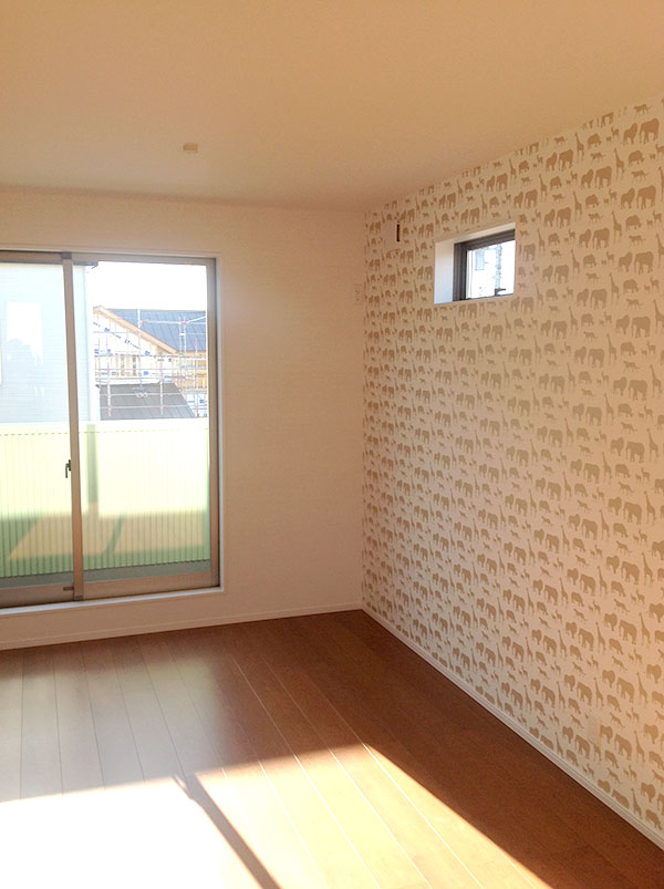 かわいいどうぶつ模様のクロスを貼った2階の一室