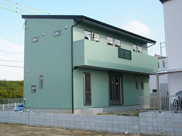 ポップなグリーンの外壁がまちに映える、かわいらしい家が出来ました。