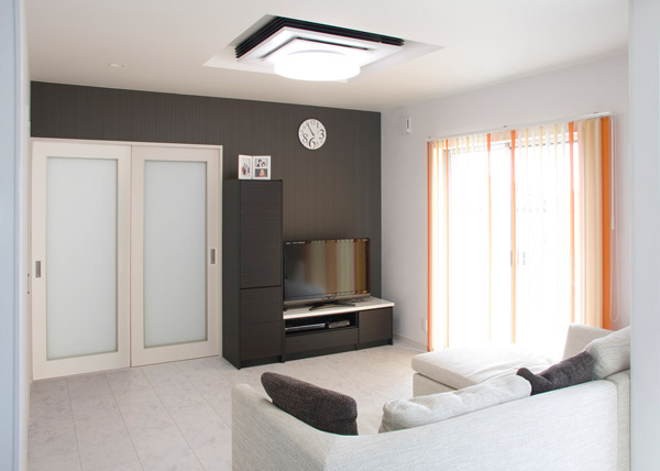落ち着いたダークブラウンの外観が印象的な、暖かな日差しがたくさん集まる明るい家が完成しました。白を基調にしたモダンで明るいリビングがポイントです。
