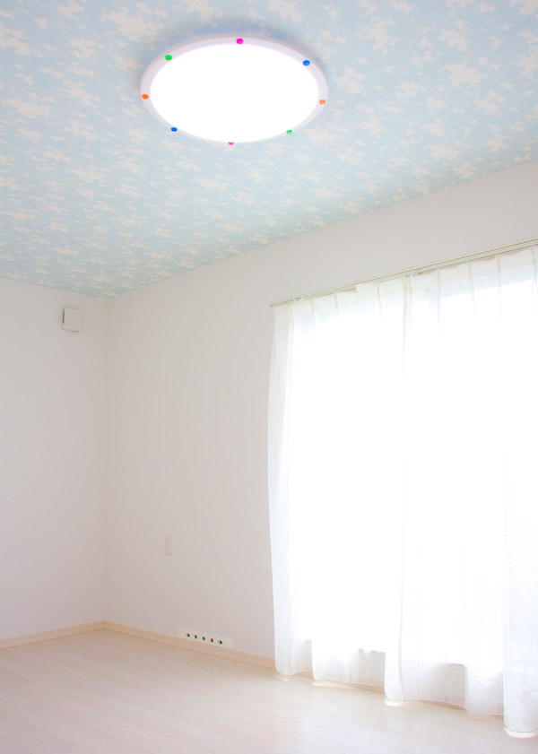 空模様の天井クロスとポップな照明が特徴的な子供部屋